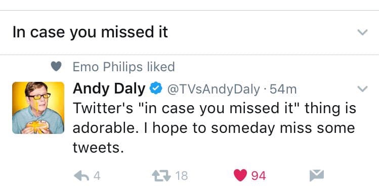 It’s a matter of personal preference, but I find that the suggested Tweets I get in the In Case You Missed It box tend to be a decently representative sample of the “good” tweets in my timeline over the past few hours.