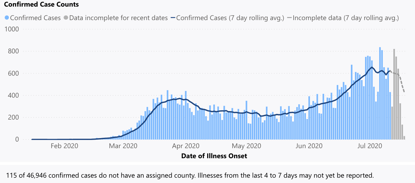 As an example, Washington had been seeing decreasing case counts, but starting in late June, the numbers rose again. Now, we’ve had a couple weeks of record new cases.