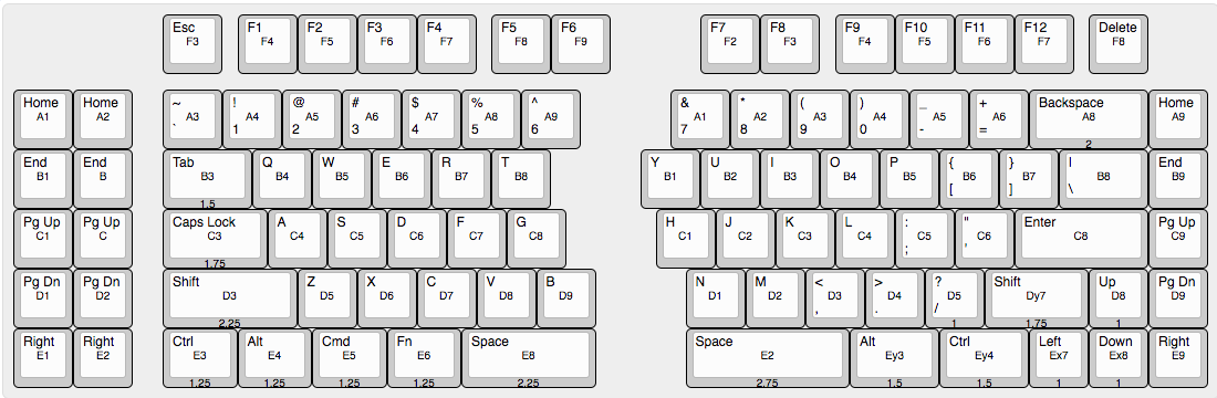 The Sinc PCB design supports a number of layout variants. I used the excellent open source keyboard-layout-editor.com to plan my layout. Though, there weren’t a ton of decisions to make; the biggest areas for customization were the arrangement of meta keys on the right side of the board and the layout of the keys surrounding each space bar.