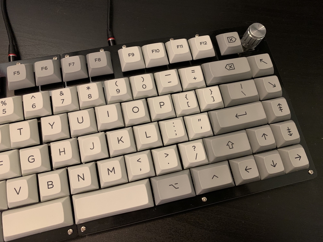 After a bunch of comparisons, I settled on PimpMyKeyboard’s DSA “Granite” set. The DSA keycap profile is uniform and flat, and aside from ergonomics I think that they just look nice.