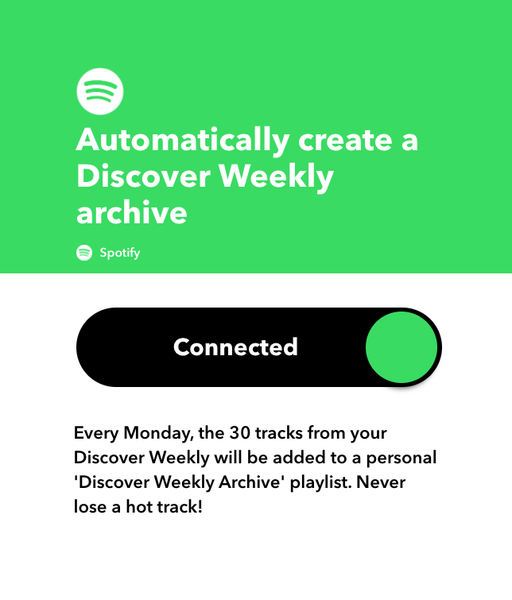 Similarly, in the past couple years IFTTT’s UI has leaned heavily into the “applet” metaphor, with these big goofy toggle switches to enable/disable automations. The site also transitioned towards a focus on community- (or, more often corporate-) created automations, at the expense of the experience for creating your own applets. Like seriously, why is 30% of the UI for an applet details page (!) taken up by the connection status toggle?